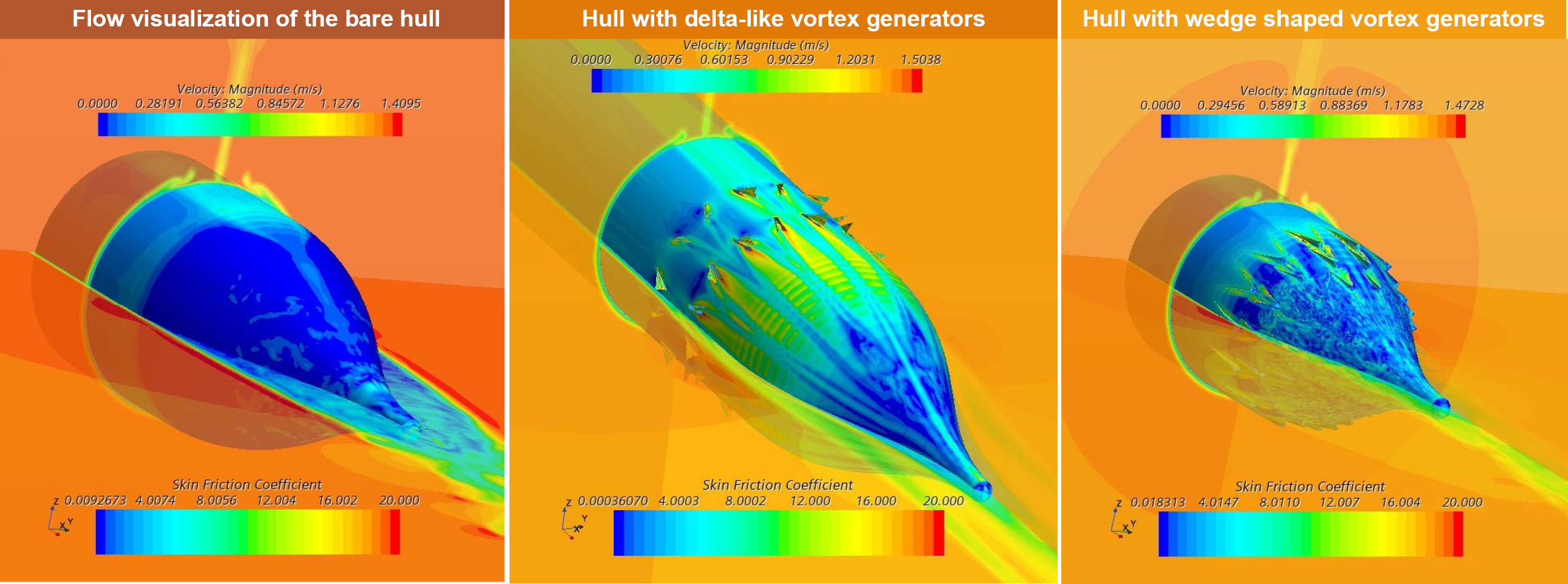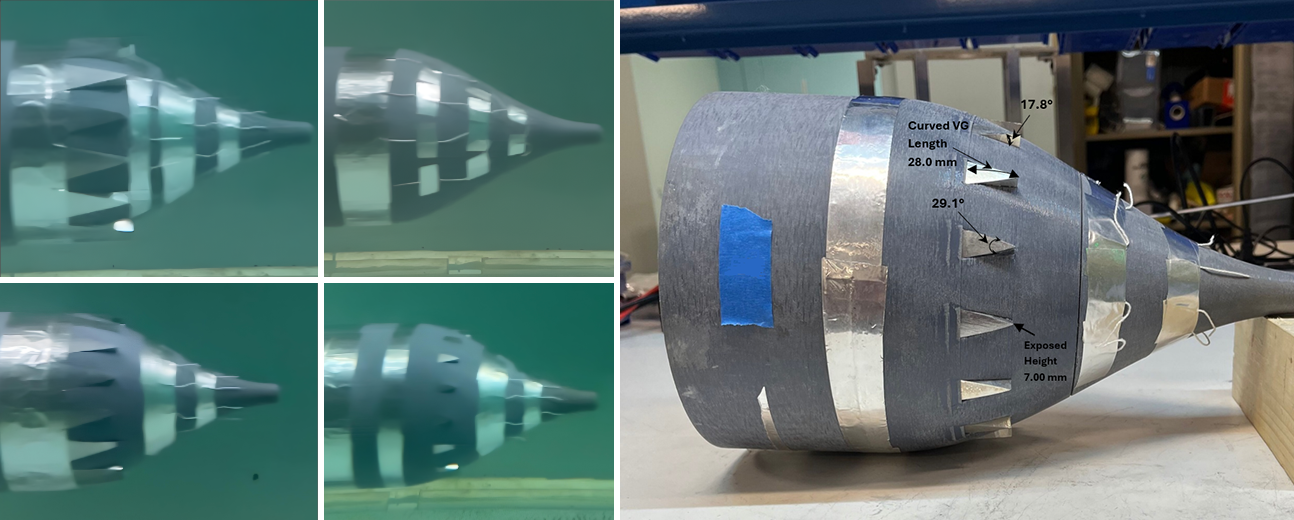 The team first established parametric trends through extensive CFD analysis, and then tested multiple hulls through rapid prototyping to validate the results experimentally. Scale models of an axisymmetric hull with a bare tail, a tail with delta wing vortex generators, and a tail with wedge vortex generators were produced and tested. The team identified wedge-like vortex generators as the key shape that could achieve this level of drag reduction.